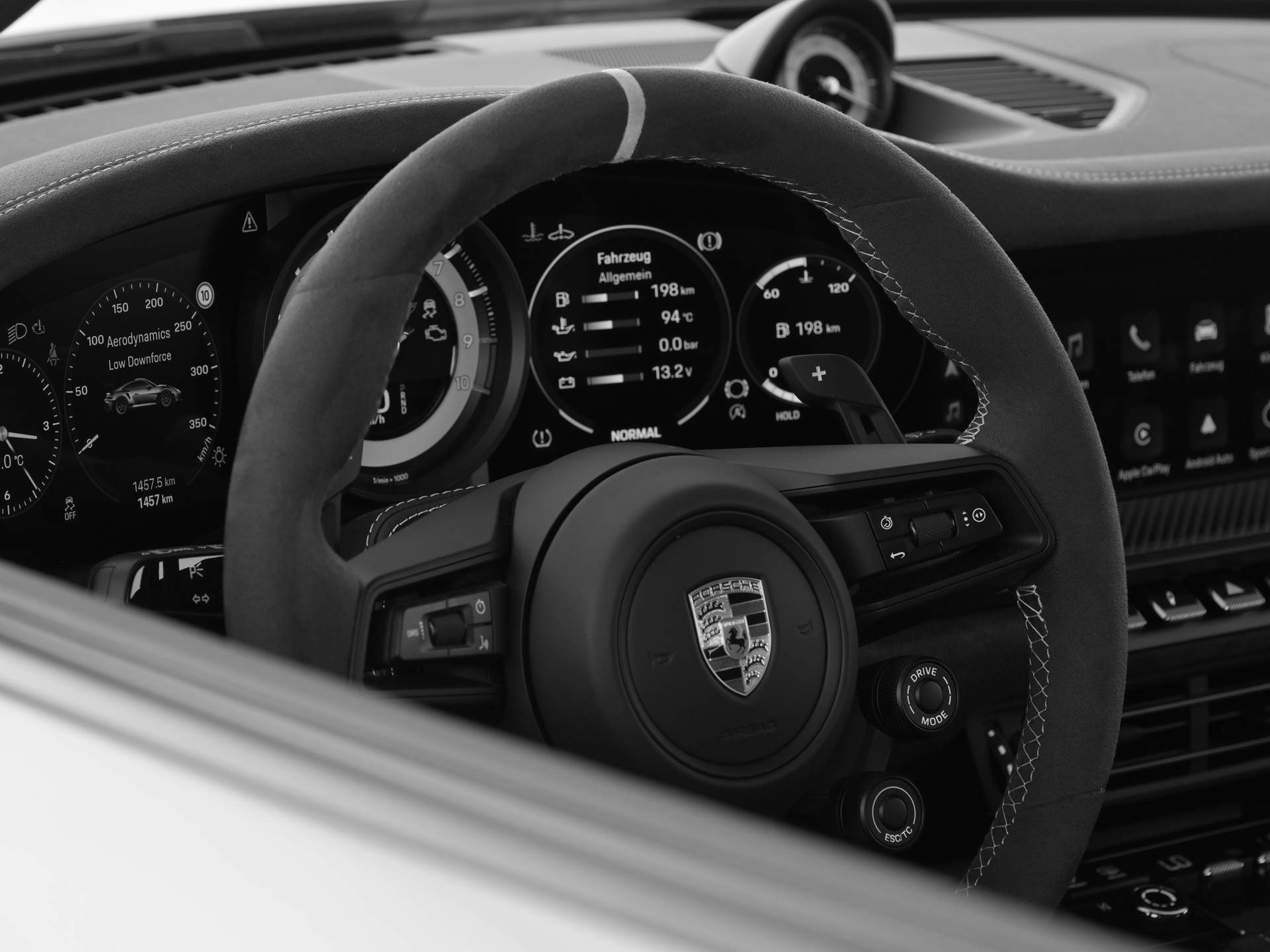 Für eine noch bessere Aerodynamik beim Porsche GT3 RS mieten sorgt ein Downforce Update, neue Aerolenker an der Vorderachse für bis zu 40kg mehr Abtrieb bei Höchstgeschwindigkeit, die S-Duct-Front mit Einkühlersystem und die breite Turbo Karosserie mit Lufteinlassblenden. Der konsequente Einsatz von kohlefaserverstärktem Kunststoff (CfK) ermöglicht ein Leergewicht von nur 1.450 kg. Das Weissach-Paket reduziert das Gewicht noch einmal um 15 kg und schärft optisch durch den Frontdeckel, das Dach und die Außenspiegel Oberschale in Sichtcarbon den Motorsportcharakter des neuen 911 GT3 RS – genauso wie der teilweise in Sichtcarbon gefertigte Heckflügel mit Drag Reduction System (DRS) für noch weniger Luftwiderstand auf der Geraden und der große „PORSCHE“ Schriftzug machen GT3 RS mieten zu einem einmaligen Erlebnis. Im Innenraum unterstreicht der Überrollkäfig hinten in Sichtcarbon die hohen Ambitionen – und bietet beim Porsche GT3 RS mieten zusätzlichen Schutz auf Rennsportniveau. Das Fine-Tuning setzt sich fort mit besonders leichten PDK-Schaltpaddles aus Magnesium, einem mit schwarzen Race-Tex bezogenen Schalttafeloberteil, Interieurteilen in Sichtcarbon, einer Plakette mit „Weissach RS“-Logo auf der Beifahrerseite sowie Kopfstützen mit gesticktem „Weissach RS“-Logo. Natürlich lässt auch das Infotainment mit Porsche Connect, Porsche Track Precision App und BOSE® Surround Sound-System mit 12 Lautsprechern beim Porsche 911 GT3 RS mieten nichts zu wünschen übrig.